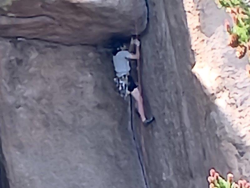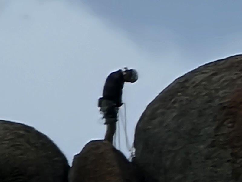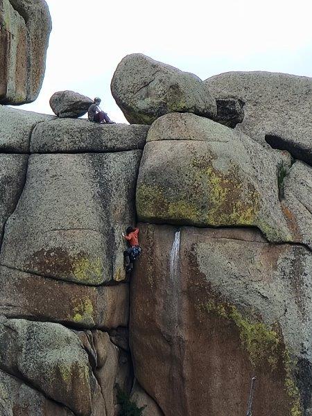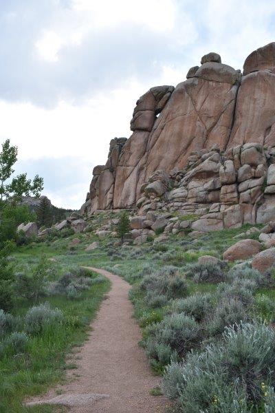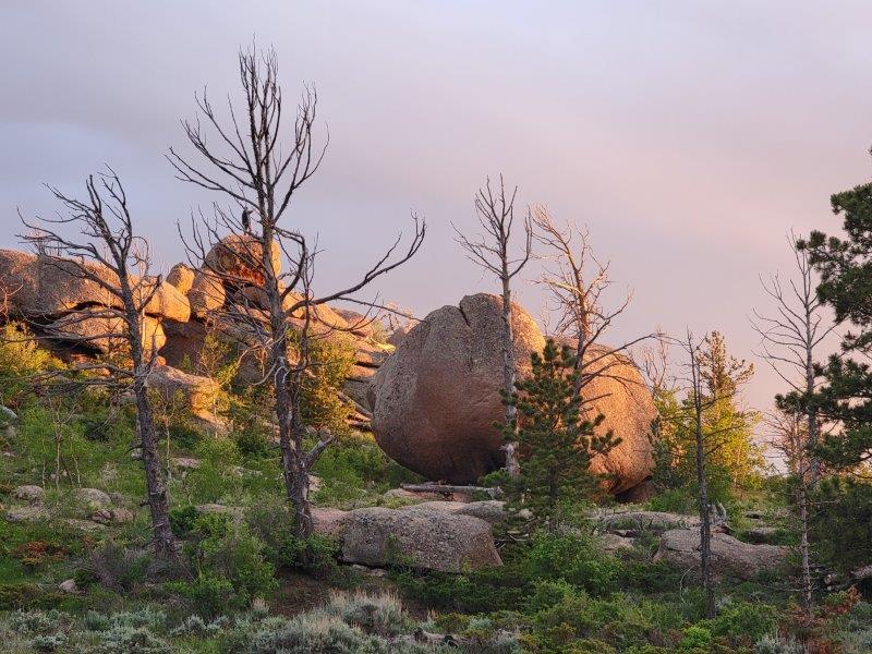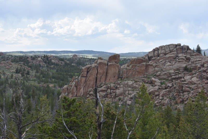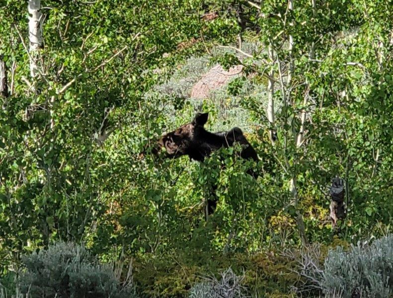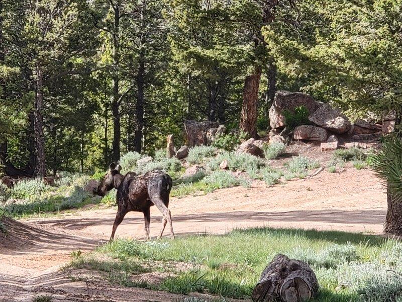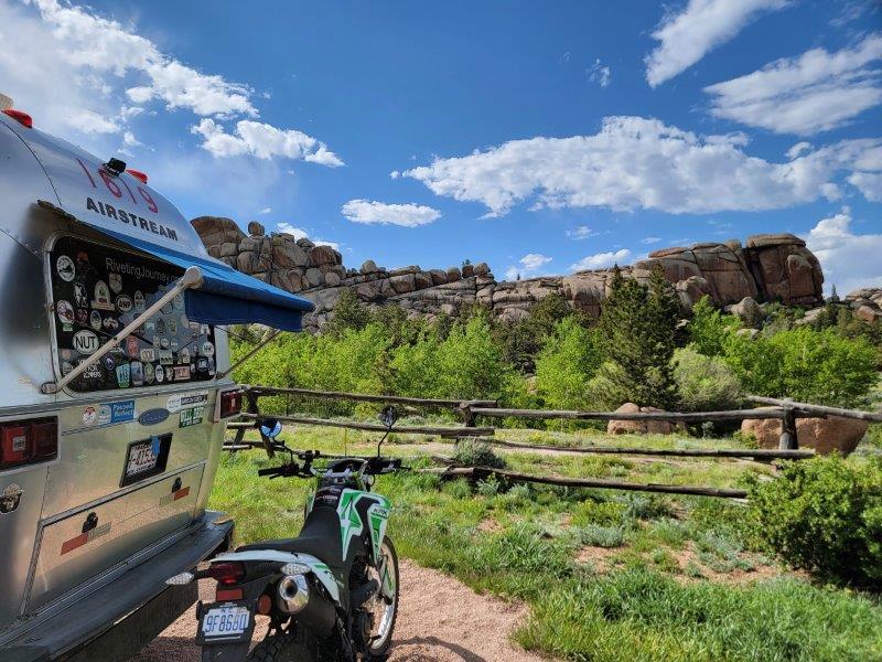 We then moved into Wyoming and discovered a new boondocking area in Vedauwoo (pronounced Veedavoo). In southern Wyoming, this is a popular spot for rock climbers, and we had a perfect view of a rock formation that attracted several climbers. We took a couple of motorbike rides and saw a young moose on one of our excursions.