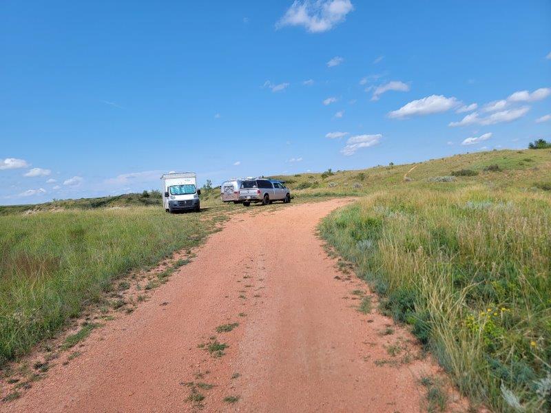 That wasn’t the end of our tire issues, however! While we were moving east through Montana, we stopped at a new-to-us boondocking location, Homestake Lake. We had pulled into a large parking area that serves as a staging area for ATVs/OHVs, and we were walking around, reading the signs. As we were walking back toward our Airstream, we heard a loud pop, followed by a hissing sound. One of our Airstream tires was losing air. Luckily, it was just a valve stem issue, not a tire puncture. Carl put the spare on, and we were able to get the valve stem replaced at a Discount Tire in Billings.